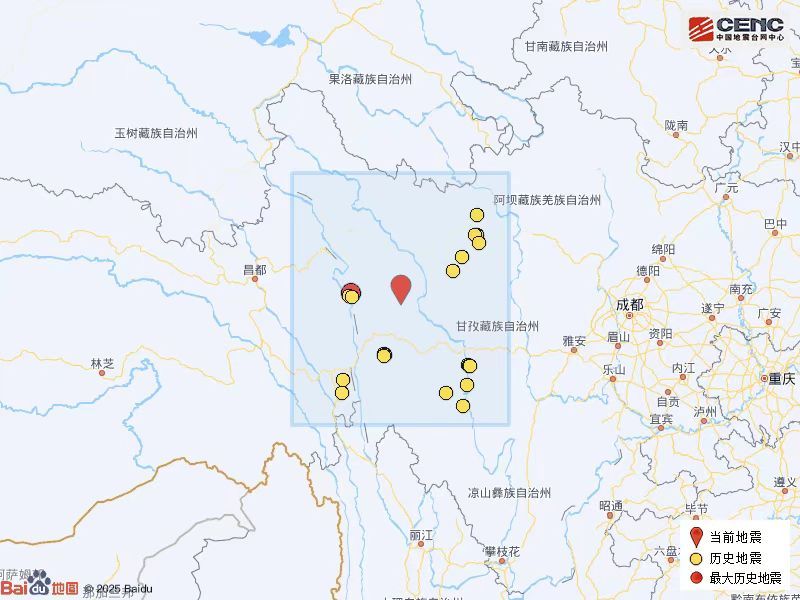 震中距新龙县45公里、距甘孜县88公里、距炉霍县99公里、距理塘县102公里、距白玉县107公里,距甘孜藏族自治州220公里,距成皆市404公里。震中5公里限度内平均海拔约4251米。